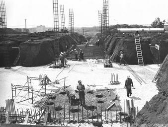 | Keywords: blackandwhite monochrome outdoor black and white Full Description: At its founding, the Marshall Space Flight Center (MSFC) inherited the Army's Jupiter and Redstone test stands, but much larger facilities were needed for the giant stages of the Saturn V. From 1960 to 1964, the existing stands were remodeled and a sizable new test area was developed. The new comprehensive test complex for propulsion and structural dynamics was unique within the nation and the free world, and they remain so today because they were constructed with foresight to meet the future as well as on going needs. Construction of the S-IC Static test stand complex began in 1961 in the west test area of MSFC, and was completed in 1964. The S-IC static test stand was designed to develop and test the 138-ft long and 33-ft diameter Saturn V S-IC first stage, or booster stage, weighing in at 280,000 pounds. Required to hold down the brute force of a 7,500,000-pound thrust produced by 5 F-1 engines, the S-IC static test stand was designed and constructed with the strength of hundreds of tons of steel and 12,000,000 pounds of cement, planted down to bedrock 40 feet below ground level. The foundation walls, constructed with concrete and steel, are 4 feet thick. The base structure consists of four towers with 40-foot-thick walls extending upward 144 feet above ground level. The structure was topped by a crane with a 135-foot boom. With the boom in the upright position, the stand was given an overall height of 405 feet, placing it among the highest structures in Alabama at the time. In addition to the stand itself, related facilities were constructed during this time. Built directly east of the test stand was the Block House, which served as the control center for the test stand. The two were connected by a narrow tunnel which housed the cables for the controls. Again to the east, just south of the Block House, was a newly constructed Pump House. Its function was to provide water to the stand to prevent melting damage during testing. The water was sprayed through small holes in the stand?s 1900 ton water deflector at the rate of 320,000 gallons per minute. In this photograph, taken Aril 4, 1962, construction workers are busy in the Pump House area. The narrower area at the top center portion of the photo is the water line area. The circular area to the foreground is the drain through which the water would feed into the pipes for delivery to the stand. UID: SPD-MARSH-0600542 Full Description: At its founding, the Marshall Space Flight Center (MSFC) inherited the Army's Jupiter and Redstone test stands, but much larger facilities were needed for the giant stages of the Saturn V. From 1960 to 1964, the existing stands were remodeled and a sizable new test area was developed. The new comprehensive test complex for propulsion and structural dynamics was unique within the nation and the free world, and they remain so today because they were constructed with foresight to meet the future as well as on going needs. Construction of the S-IC Static test stand complex began in 1961 in the west test area of MSFC, and was completed in 1964. The S-IC static test stand was designed to develop and test the 138-ft long and 33-ft diameter Saturn V S-IC first stage, or booster stage, weighing in at 280,000 pounds. Required to hold down the brute force of a 7,500,000-pound thrust produced by 5 F-1 engines, the S-IC static test stand was designed and constructed with the strength of hundreds of tons of steel and 12,000,000 pounds of cement, planted down to bedrock 40 feet below ground level. The foundation walls, constructed with concrete and steel, are 4 feet thick. The base structure consists of four towers with 40-foot-thick walls extending upward 144 feet above ground level. The structure was topped by a crane with a 135-foot boom. With the boom in the upright position, the stand was given an overall height of 405 feet, placing it among the highest structures in Alabama at the time. In addition to the stand itself, related facilities were constructed during this time. Built directly east of the test stand was the Block House, which served as the control center for the test stand. The two were connected by a narrow tunnel which housed the cables for the controls. Again to the east, just south of the Block House, was a newly constructed Pump House. Its function was to provide water to the stand to prevent melting damage during testing. The water was sprayed through small holes in the stand?s 1900 ton water deflector at the rate of 320,000 gallons per minute. In this photograph, taken Aril 4, 1962, construction workers are busy in the Pump House area. The narrower area at the top center portion of the photo is the water line area. The circular area to the foreground is the drain through which the water would feed into the pipes for delivery to the stand. UID: SPD-MARSH-0600542 |