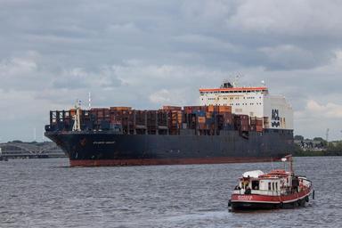 Keywords: container ship port freighter ship transport water cargo container shipping trade in goods river container handling hamburg elbe trade