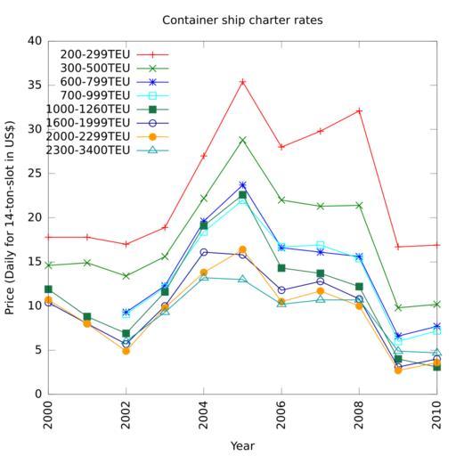 | Keywords: Container-ship-rates.svg en Container ship charter rates 2000-2010 in U S dollars per 14-ton-slot per day Data from page 86 of cite book United Nations Conference on Trade and Development UNCTAD United Nations Conference on Trade and Development Review of Maritime Transport 2010 http //www unctad org/Templates/Download asp docid 14218 lang 1 intItemID 2068 2010 United Nations New York and Geneva PDF 978-92-1-112810-9 ; Gnuplot data file <pre> From RMT 2010 p 86 2000 17 8 14 6 11 9 10 4 10 7 2001 17 8 14 9 8 8 8 0 8 0 2002 17 0 13 4 9 3 9 1 6 9 5 7 4 9 6 0 2003 18 9 15 6 12 3 12 1 11 6 10 0 9 8 9 3 2004 27 0 22 2 19 6 18 4 19 1 16 1 13 8 13 2 2005 35 4 28 8 23 7 22 0 22 6 15 8 16 4 13 0 2006 28 0 22 0 16 6 16 7 14 3 11 8 10 5 10 2 2007 29 8 21 3 16 1 16 9 13 7 12 8 11 7 10 7 2008 32 1 21 4 15 6 15 4 12 2 10 8 10 0 10 7 2009 16 7 9 8 6 6 6 0 4 0 3 1 2 7 4 9 2010 16 9 10 2 7 7 7 2 3 1 4 0 3 6 4 7 </pre> ; Gnuplot script file <pre> set terminal svg enhanced font Sans size 600 600 set output container-ship-rates svg set title Container ship charter rates set samples 1001 high quality set border 31 linewidth 3 thin border set ylabel Price Daily for 14-ton-slot in US set xlabel Year set xtics rotate set key inside top left plot 'container-rates txt' using 1 2 with linesp title 200-299TEU \ 'container-rates txt' using 1 3 with linesp title 300-500TEU \ 'container-rates txt' using 1 4 with linesp title 600-799TEU \ 'container-rates txt' using 1 5 with linesp title 700-999TEU \ 'container-rates txt' using 1 6 with linesp title 1000-1260TEU \ 'container-rates txt' using 1 7 with linesp title 1600-1999TEU \ 'container-rates txt' using 1 8 with linesp title 2000-2299TEU \ 'container-rates txt' using 1 9 with linesp title 2300-3400TEU set output flushes buffer </pre> ; Gnuplot command <tt> load 'container-rates-script txt'</tt> own Haus 2011-03-04 Cc-zero Container ships |