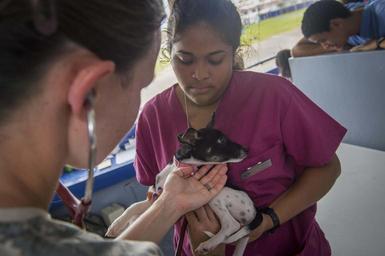 | Keywords: Continuing Promise 2015 150601-N-NK134-086.jpg en 150601-N-NK134-086 COLÓN Panama - Army Capt Emily Corbin a native of Boulder Junction Wis and a veterinarian assigned to Public Health Command District Fort Meade Md works with a Panamanian veterinary student as they perform an exam on a dog at a veterinarian site established at Roberto Mariano Bula Stadium in support of Continuing Promise 2015 Continuing Promise is a U S Southern Command-sponsored and U S Naval Forces Southern Command/U S 4th Fleet-conducted deployment to conduct civil-military operations including humanitarian-civil assistance subject matter expert exchanges medical dental veterinary and engineering support and disaster response to partner nations and to show U S support and commitment to Central and South America and the Caribbean 2015-06-01 June 1 2015 https //www dvidshub net/image/1971820 150601-N-NK134-086 2015-06-03 08 05 COLON PA PD-USGov-Military-Navy Fort Meade Images from DoD uploaded by Fæ Continuing Promise 2015 |