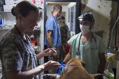 | Keywords: Continuing Promise 2015 150716-N-PD309-063.jpg en 150716-N-PD309-063 BUENAVENTURA Colombia July 16 2015 Army Capt Emily Corbin left a native of Boulder Junction Wis and a veterinarian assigned to Public Health Command District Fort Meade Md and a local Colombian veterinarian perform surgery on a dog at a veterinarian site established at Eufermeria Canina Del Grupo Antiexplosivos Urbano during Continuing Promise 2015 Continuing Promise is a U S Southern Command-sponsored and U S Naval Forces Southern Command/U S 4th Fleet-conducted deployment to conduct civil-military operations including humanitarian-civil assistance subject matter expert exchanges medical dental veterinary and engineering support and disaster response to partner nations and to show U S support and commitment to Central and South America and the Caribbean U S Navy photo by Mass Communication Specialist 3rd Class Deven Leigh Ellis/Released <br>Unit U S Naval Forces Southern Command U S Fourth Fleet 2015-07-16 Petty Officer 3rd Class Deven Ellis https //www dvidshub net/image/2076101/continuing-promise-2015 150716-N-PD309-063 2015-07-20 09 24 BUENAVENTURA CO PD-USGov-Military-Navy Fort Meade Images from DoD uploaded by Fæ |