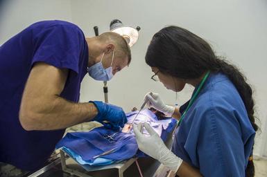 | Keywords: Continuing Promise 2015 150820-N-YM856-110.jpg en 150820-N-YM856-110 SANTO DOMINGO Dominican Republic Aug 20 2015 Army Maj Jeremiah Nelson a veterinarian assigned to 85th Civil Affairs Brigade Fort Hood Texas and a Dominican veterinary technician perform surgery on a dog at a veterinary site established at Hospital Clinico Veterinario during Continuing Promise 2015 Continuing Promise is a U S Southern Command-sponsored and U S Naval Forces Southern Command/U S 4th Fleet-conducted deployment to conduct civil-military operations including humanitarian-civil assistance subject matter expert exchanges medical dental veterinary and engineering support and disaster response to partner nations and to show U S support and commitment to Central and South America and the Caribbean U S Navy photo by Mass Communication Specialist 2nd Class Brittney Cannady/Released <br>Unit Expeditionary Combat Camera 2015-08-20 Petty Officer 2nd Class Brittney Cannady https //www dvidshub net/image/2137130/continuing-promise-2015 150820-N-YM856-110 2015-08-22 17 02 SANTO DOMINGO DO PD-USGov-Military-Navy Fort Hood Texas Images from DoD uploaded by Fæ United States Navy images from Santo Domingo Continuing Promise 2015 Santo Domingo Dominican Republic |