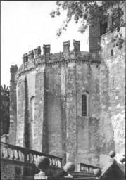 | Keywords: arquitectura gótico portugal convento de cristo conventodecristo tomar fundação calouste gulbenkian fundaçãocaloustegulbenkian crenellated convent mário tavares chicó máriotavareschicó mário novais márionovais gótica biblioteca de arte bibliotecadearte Exterior da Charola. Fotógrafo: Mário Novais, 1899-1967. Orientador científico: Mário Tavares Chicó, 1905-1966 Data aproximada da produção da fotografia original: 1954. [CFT015.360.ic] Convento de Cristo O Convento da Ordem de Cristo e o Castelo Templário, em Tomar, formam um conjunto monumental único no seu género. O Castelo foi fundado em 1160 por Dom Gualdim Pais, Mestre provincial da Ordem do Templo em Portugal, e dentro das suas muralhas viveram as primeiras gentes de Tomar. O coração da fortaleza, a Alcáçova, com a torre de menagem, foi construída a Oriente; o lugar místico, a Igreja octogonal Templária, foi construída a Ocidente. Com o extermínio da Ordem pelas perseguições de Filipe, o Belo, Rei de França, os Templários encontraram, em Portugal, a continuidade da sua sagrada missão de Cavalaria. A Ordem do Templo foi extinta em 1312, mas os seus bens e, em parte, a sua vocação, foram transmitidos, em Portugal, à Ordem de Cristo, criada em 1319. Sob os auspícios de D. Dinis é, então, fundada a "Ordem dos Cavaleiros de Cristo", a qual foi durante quatro anos negociada pelo monarca com a Santa Sé, e veio a integrar pessoas e bens da extinta Ordem do Templo. É com a Ordem de Cristo que a nação portuguesa se abre para a empresa das descobertas marítimas do séc. XV. Tomar é, então, sede da Ordem, e o Infante D. Henrique o seu Mestre. Com a expansão da fé cristã e do reino, também a sede da Ordem de Cristo se dilata. Os séculos e a história de Portugal vão deixando, na arquitectura do Convento, testemunhos do tempo e dos homens que lideraram os destinos de Portugal. Durante o governo do infante D. Henrique foram construídos dois claustros góticos no Convento. Com D. Manuel, a igreja templária é prolongada para Ocidente por uma construção que serviria o Capítulo da Ordem. Profusamente impregnada pela simbólica dos Cavaleiros de Cristo, esta construção aloja na sua fachada ocidental a famosa Janela da Sala do Capítulo, de Diogo de Arruda (cerca de 1510). Mais tarde, D. João III pretende fazer profundas mudanças na Ordem, alterando as suas Regras e transformando os Cavaleiros em monges contemplativos; é a partir deste reinado que se iniciam importantes trabalhos de ampliação do Convento, com vista a consumar a Reforma da Ordem. Esses trabalhos vão continuar através de vários reinados, até ao século XVIII, deixando marcas de diversas tendências artísticas. O Convento de Cristo encerra no seu conjunto arquitectónico testemunhos da arte do Românico, templária, do Gótico e do Manuelino, ao tempo das Descobertas, do Renascimento joanino, do Maneirismo, nas suas várias facetas e, por fim, do Barroco, presente em vária ornamentação arquitectónica. Da estrutura arquitectural do Convento, além das edificações construídas em torno da igreja templária, há a salientar o conjunto de quatro grandes claustros articulados por dois eixos em cruz latina, e também um aqueduto com 6 Km de extensão mandado edificar por Filipe II. Integra os domínios conventuais uma área de floresta e cultivo conhecida por Mata dos Sete Montes, por estar confinada por sete colinas de acentuado relevo. (Fonte: IPPAR - tinyurl.com/4dnm5m) Exterior da Charola. Fotógrafo: Mário Novais, 1899-1967. Orientador científico: Mário Tavares Chicó, 1905-1966 Data aproximada da produção da fotografia original: 1954. [CFT015.360.ic] Convento de Cristo O Convento da Ordem de Cristo e o Castelo Templário, em Tomar, formam um conjunto monumental único no seu género. O Castelo foi fundado em 1160 por Dom Gualdim Pais, Mestre provincial da Ordem do Templo em Portugal, e dentro das suas muralhas viveram as primeiras gentes de Tomar. O coração da fortaleza, a Alcáçova, com a torre de menagem, foi construída a Oriente; o lugar místico, a Igreja octogonal Templária, foi construída a Ocidente. Com o extermínio da Ordem pelas perseguições de Filipe, o Belo, Rei de França, os Templários encontraram, em Portugal, a continuidade da sua sagrada missão de Cavalaria. A Ordem do Templo foi extinta em 1312, mas os seus bens e, em parte, a sua vocação, foram transmitidos, em Portugal, à Ordem de Cristo, criada em 1319. Sob os auspícios de D. Dinis é, então, fundada a "Ordem dos Cavaleiros de Cristo", a qual foi durante quatro anos negociada pelo monarca com a Santa Sé, e veio a integrar pessoas e bens da extinta Ordem do Templo. É com a Ordem de Cristo que a nação portuguesa se abre para a empresa das descobertas marítimas do séc. XV. Tomar é, então, sede da Ordem, e o Infante D. Henrique o seu Mestre. Com a expansão da fé cristã e do reino, também a sede da Ordem de Cristo se dilata. Os séculos e a história de Portugal vão deixando, na arquitectura do Convento, testemunhos do tempo e dos homens que lideraram os destinos de Portugal. Durante o governo do infante D. Henrique foram construídos dois claustros góticos no Convento. Com D. Manuel, a igreja templária é prolongada para Ocidente por uma construção que serviria o Capítulo da Ordem. Profusamente impregnada pela simbólica dos Cavaleiros de Cristo, esta construção aloja na sua fachada ocidental a famosa Janela da Sala do Capítulo, de Diogo de Arruda (cerca de 1510). Mais tarde, D. João III pretende fazer profundas mudanças na Ordem, alterando as suas Regras e transformando os Cavaleiros em monges contemplativos; é a partir deste reinado que se iniciam importantes trabalhos de ampliação do Convento, com vista a consumar a Reforma da Ordem. Esses trabalhos vão continuar através de vários reinados, até ao século XVIII, deixando marcas de diversas tendências artísticas. O Convento de Cris