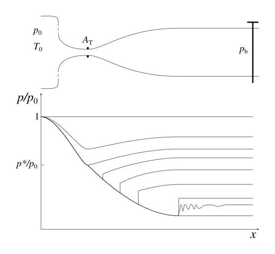 | Keywords: Converging-diverging nozzle, pressure distribution during acceleration of flow.svg en The pressure distribution along a pipe with converging-diverging section for various cases of decreasing back pressure 2015-02 own Olivier Cleynen other versions cc-zero Uploaded with UploadWizard SVG physics Convergent-divergent nozzles |