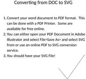 | Keywords: Converting from DOC to SVG.svg en An example file created in MS Word to show how this conversion can be done stop doc files appearing on Wikipedia --- 1 Convert your word document to PDF format This can be done with a PDF Printer Some are available for free online 2 You can either open your PDF Document in Adobe Illustrator and select File>Save As> and select SVG from or use an online PDF to SVG conversion service 3 You should have your SVG File Own RaviC in Microsoft Word 25/11/08 today SVG User Guides |