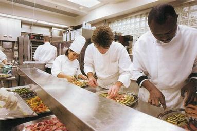 | Keywords: Cookers in the White House kitchen.jpg en White House Executive Chef Cristeta Cris Comerford background-left in chef's hat helps prepare trays of food in the White House kitchen in preparations for the official dinner for the Prince of Wales and Duchess of Cornwall White House White House Shealah Craighead 2005-11-02 PD-USGov White House kitchen People at work Photographs by Shealah Craighead Chef's hat | ||||