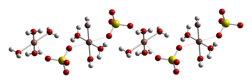 Keywords: Copper(II)-sulfate-pentahydrate-CuOSOCu-chain-from-xtal-2007-CM-3D-balls.png Ball-and-stick diagram of part of the crystal structure of copper II sulfate pentahydrate CuSO<sub>4</sub>·5H<sub>2</sub>O Colour code Copper Cu orange-pink Sulfur S yellow Oxygen O red Hydrogen H white Crystal structure from http //dx doi org/10 2138/am 2007 2229 American Mineralogist 2007 92 532 “545 Image generated in http //www crystalmaker com/ CrystalMaker 8 3 Own 2010-07-26 Ben Mills Benjah-bmm27 Images by Ben Mills Ball-and-stick models Crystal structures of copper II sulfate pentahydrate |