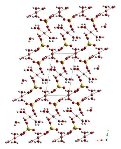 Keywords: Copper(II)-sulfate-pentahydrate-c-axis-xtal-2007-CM-3D-balls.png Ball-and-stick diagram of part of the crystal structure of copper II sulfate pentahydrate CuSO<sub>4</sub>·5H<sub>2</sub>O Viewed down the c axis of the triclinic unit cell Colour code Copper Cu orange-pink Sulfur S yellow Oxygen O red Hydrogen H white Crystal structure from http //dx doi org/10 2138/am 2007 2229 American Mineralogist 2007 92 532 “545 Image generated in http //www crystalmaker com/ CrystalMaker 8 3 Own 2010-07-26 Ben Mills Benjah-bmm27 Images by Ben Mills Ball-and-stick models Crystal structures of copper II sulfate pentahydrate |