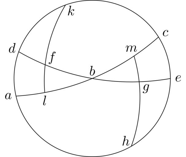 Keywords: Coppernicus 030.svg de à ber die Kreisbewegungen der Weltkörper 30 File Kreisbewegungen-Coppernicus-0 djvu p 62 1879 w Nicolaus Copernicus File Coppernicus_030 png PD-old-100 De revolutionibus drawings LaTeX Source Code <syntaxhighlight lang latex > complile with »pdflatex« \documentclasstikz convert pdf2svg standalone \usepackage tkz-euclide \usetkzobj all \begin document \begin tikzpicture \tkzSetUpLineline width 0 4pt \tkzDefPoint -167 2 A \tkzDefPoint 0 0 B \tkzDefPoint 32 2 C \tkzDefPoint 160 2 D \tkzDefPoint 0 2 E \tkzDefPoint -60 2 H \tkzDefPoint 110 2 K \begin pgfinterruptboundingbox \tkzCircumCenter D B E \tkzGetPoint O1 \tkzCircumCenter A B C \tkzGetPoint O2 \end pgfinterruptboundingbox \tkzDefPointByrotation center O1 angle -12 5 B \tkzGetPoint F \tkzDefPointByrotation center O1 angle 12 B \tkzGetPoint G \tkzDefPointByrotation center O2 angle -12 B \tkzGetPoint L \tkzDefPointByrotation center O2 angle 11 5 B \tkzGetPoint M \begin pgfinterruptboundingbox \tkzCircumCenter K F L \tkzGetPoint O3 \tkzCircumCenter H G M \tkzGetPoint O4 \end pgfinterruptboundingbox \tkzDrawCircle B D \tkzDrawArccolor black O1 D E \tkzDrawArccolor black O2 A C \tkzDrawArccolor black O3 K L \tkzDrawArccolor black O4 H M \draw A + 180 0 2 node a ; \draw B + 90 0 2 node b ; \draw C + 30 0 2 node c ; \draw D + 150 0 2 node d ; \draw E + 0 0 2 node e ; \draw F + 45 0 25 node f ; \draw G + -45 0 25 node g ; \draw H + 135 0 2 node h ; \draw K + -45 0 2 node k ; \draw L + -90 0 2 node l ; \draw M + 110 0 2 node m ; \end tikzpicture \end document </syntaxhighlight>