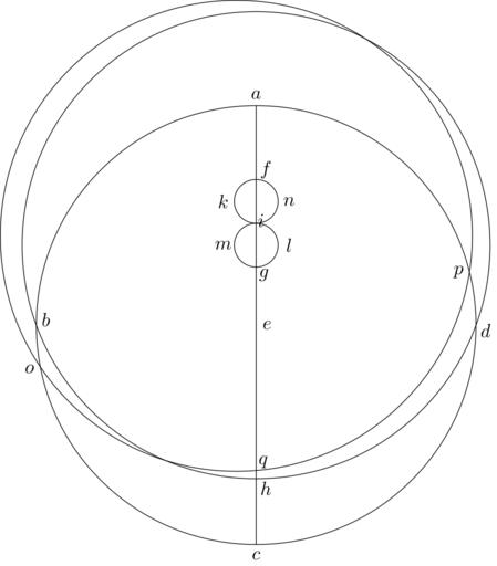 | Keywords: Coppernicus 041.svg de à ber die Kreisbewegungen der Weltkörper 41 File Kreisbewegungen-Coppernicus-0 djvu p 136 1879 w Nicolaus Copernicus File Coppernicus_041 png PD-old-100 De revolutionibus drawings LaTeX Source Code <syntaxhighlight lang latex > complile with »pdflatex« \documentclasstikz convert pdf2svg standalone \usepackage tkz-euclide \usetkzobj all \begin document \begin tikzpicture \tkzSetUpLineline width 0 4pt \tkzDefPoint 90 4 A \tkzDefPoint 180 4 B \tkzDefPoint -90 4 C \tkzDefPoint 0 4 D \tkzDefPoint 0 0 E \tkzDefPoint -90 2 8 H \tkzDefPoint -169 4 O \tkzDefPoint 14 4 P \tkzDefPoint -90 2 65 Q \tkzDrawCircle E A \begin pgfinterruptboundingbox \tkzCircumCenter O P Q \tkzGetPoint X1 \tkzCircumCenter B H D \tkzGetPoint X2 \tkzInterLC A C X2 X1 \tkzGetPoints I G \coordinate X3 at X2 2 I ; \tkzInterLC A C X3 I \tkzGetPoints F I \end pgfinterruptboundingbox \tkzDrawCircle X1 O \tkzDrawCircle X2 B \tkzDrawCircle X2 X1 \tkzDrawCircle X3 I \tkzDefPointByrotation center X2 angle -90 I \tkzGetPoint L \tkzDefPointByrotation center X2 angle 90 I \tkzGetPoint M \tkzDefPointByrotation center X3 angle -90 I \tkzGetPoint K \tkzDefPointByrotation center X3 angle 90 I \tkzGetPoint N \draw A -- C ; \draw A + 90 0 2 node a ; \draw B + 30 0 2 node b ; \draw C + -90 0 2 node c ; \draw D + -30 0 2 node d ; \draw E + 0 0 2 node e ; \draw F + 45 0 25 node f ; \draw G + -45 0 2 node g ; \draw H + -45 0 25 node h ; \draw I + 30 0 1 node i ; \draw K + 180 0 2 node k ; \draw L + 0 0 2 node l ; \draw M + 180 0 2 node m ; \draw N + 0 0 2 node n ; \draw O + -170 0 2 node o ; \draw P + 180 0 2 node p ; \draw Q + 50 0 2 node q ; \end tikzpicture \end document </syntaxhighlight> |