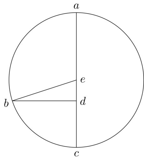 | Keywords: Coppernicus 059.svg de à ber die Kreisbewegungen der Weltkörper 59 File Kreisbewegungen-Coppernicus-0 djvu p 177 1879 w Nicolaus Copernicus File Coppernicus_059 png PD-old-100 De revolutionibus drawings LaTeX Source Code <syntaxhighlight lang latex > complile with »pdflatex« \documentclasstikz convert pdf2svg standalone \begin document \begin tikzpicture \pgfmathsetmacro \EA 2 1 ; \coordinate A at 90 \EA ; \coordinate B at -162 \EA ; \coordinate C at -90 \EA ; \coordinate D at A -B ; \coordinate E at 0 0 ; \draw E circleradius \EA; \draw B -- E ; \draw C -- A ; \draw B -- D ; \draw A + 90 0 2 node a ; \draw B + -162 0 2 node b ; \draw C + -90 0 2 node c ; \draw D + 0 0 2 node d ; \draw E + 0 0 2 node e ; \end tikzpicture \end document </syntaxhighlight> |