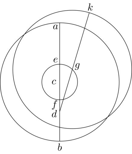 Keywords: Coppernicus 063.svg de à ber die Kreisbewegungen der Weltkörper 63 File Kreisbewegungen-Coppernicus-0 djvu p 181 1879 w Nicolaus Copernicus File Coppernicus_063 png PD-old-100 De revolutionibus drawings LaTeX Source Code <syntaxhighlight lang latex > complile with »pdflatex« \documentclasstikz convert pdf2svg standalone \usetikzlibrary calc intersections \begin document \begin tikzpicture \pgfmathsetmacro \CA 2 03 ; \pgfmathsetmacro \CE 0 3 \CA ; \coordinate A at 90 \CA ; \coordinate B at -90 \CA ; \coordinate C at 0 0 ; \coordinate D at -90 0 5 \CA ; \coordinate E at 90 \CE ; \coordinate F at -90 \CE ; \coordinate G at 45 \CE ; \coordinate K' at D 2 5 G ; \pathdraw name path circleGK G circleradius \CA; \pathname path lineGK' G -- K' ; \pathname intersections of circleGK and lineGK' name sectionK ; \coordinate K at sectionK-1 ; \draw C circleradius \CA; \draw C circleradius \CE; \draw A -- B ; \draw D -- K ; \draw A + -135 0 2 node a ; \draw B + -90 0 2 node b ; \draw C + 180 0 2 node c ; \draw D + -160 0 2 node d ; \draw E + 135 0 2 node e ; \draw F + -135 0 25 node f ; \draw G + 30 0 2 node g ; \draw K + 80 0 2 node k ; \end tikzpicture \end document </syntaxhighlight> |