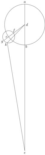 | Keywords: Coppernicus 078.svg de à ber die Kreisbewegungen der Weltkörper 78 File Kreisbewegungen-Coppernicus-0 djvu p 230 1879 w Nicolaus Copernicus File Coppernicus_078 png PD-old-100 De revolutionibus drawings LaTeX Source Code <syntaxhighlight lang latex > complile with »pdflatex« \documentclasstikz convert pdf2svg standalone \usepackage tkz-euclide \usetkzobj all \begin document \begin tikzpicture \tkzSetUpLineline width 0 4pt \pgfmathsetmacro \DA 1 9 ; \tkzDefPoint 90 \DA A \tkzDefPoint -90 \DA B \tkzDefPoint -143 \DA C \tkzDefPoint 0 0 D \tkzDefPoint -90 6 2 \DA E \coordinate G at D 1 3 C ; \tkzDefPointByrotation center C angle 40 G \tkzGetPoint K \tkzInterLC D G C G \tkzGetPoints F G \tkzDrawCircle D A \tkzDrawCircle C G \draw A -- E ; \draw D -- K ; \draw D -- G ; \draw E -- K ; \draw A + 90 0 2 node a ; \draw B + -45 0 2 node b ; \draw C + 180 0 2 node c ; \draw D + 0 0 2 node d ; \draw E + -90 0 2 node e ; \draw F + 80 0 25 node f ; \draw G + -140 0 2 node g ; \draw K + -130 0 2 node k ; \end tikzpicture \end document </syntaxhighlight> |