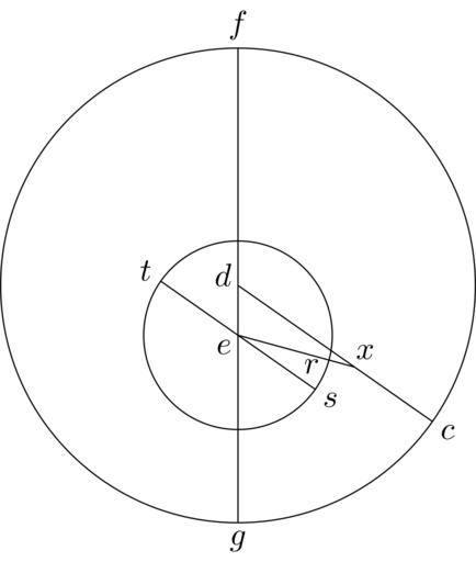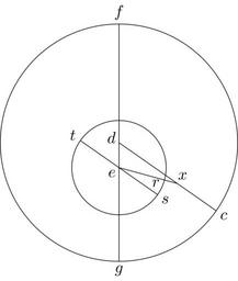 | Keywords: Coppernicus 102.svg de à ber die Kreisbewegungen der Weltkörper 102 File Kreisbewegungen-Coppernicus-0 djvu p 286 1879 w Nicolaus Copernicus File Coppernicus_102 png PD-old-100 De revolutionibus drawings LaTeX Source Code <syntaxhighlight lang latex > complile with »pdflatex« \documentclasstikz convert pdf2svg standalone \usepackage tkz-euclide \usetkzobj all \begin document \begin tikzpicture \tkzSetUpLineline width 0 4pt \pgfmathsetmacro \DC 2 58 ; \tkzDefPoint -35 \DC C \tkzDefPoint 0 0 D \tkzDefPoint -90 0 21 \DC E \tkzDefPoint 90 \DC F \tkzDefPoint -90 \DC G \coordinate X at D 0 6 C ; \coordinate R at E 0 78 X ; \begin pgfinterruptboundingbox \tkzDefLineparallel through E D C \tkzGetPoint C2 \tkzInterLC E C2 E R \tkzGetPoints T S \end pgfinterruptboundingbox \tkzDrawCircle D F \tkzDrawCircle E R \draw F -- G ; \draw D -- C ; \draw E -- X ; \draw S -- T ; \draw C + -35 0 2 node c ; \draw D + 145 0 2 node d ; \draw E + -140 0 2 node e ; \draw F + 90 0 25 node f ; \draw G + -90 0 2 node g ; \draw R + -160 0 2 node r ; \draw S + -35 0 2 node s ; \draw T + 145 0 2 node t ; \draw X + 55 0 2 node x ; \end tikzpicture \end document </syntaxhighlight> |