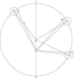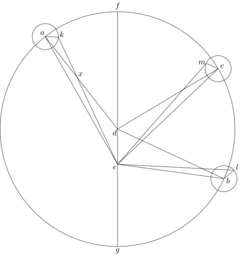 | Keywords: Coppernicus 104.svg de à ber die Kreisbewegungen der Weltkörper 104 File Kreisbewegungen-Coppernicus-0 djvu p 289 1879 w Nicolaus Copernicus File Coppernicus_104 png PD-old-100 De revolutionibus drawings LaTeX Source Code <syntaxhighlight lang latex > complile with »pdflatex« \documentclasstikz convert pdf2svg standalone \usepackage tkz-euclide \usetkzobj all \begin document \begin tikzpicture \tkzSetUpLineline width 0 4pt \pgfmathsetmacro \DA 5 22 ; \pgfmathsetmacro \AK 0 58 ; \tkzDefPoint 128 \DA A \tkzDefPoint -25 \DA B \tkzDefPoint 31 \DA C \tkzDefPoint 0 0 D \tkzDefPoint -90 2 7 \AK E \tkzDefPoint 90 \DA F \tkzDefPoint -90 \DA G \begin pgfinterruptboundingbox \tkzInterLCR D A A \AK cm \tkzGetPoints K1 K2 \tkzInterLCR D B B \AK cm \tkzGetPoints L1 L2 \tkzInterLCR D C C \AK cm \tkzGetPoints M1 M2 \end pgfinterruptboundingbox \tkzDefPointByrotation center A angle 50 K1 \tkzGetPoint K \tkzDefPointByrotation center B angle -115 L1 \tkzGetPoint L \tkzDefPointByrotation center C angle -55 M1 \tkzGetPoint M \tkzInterLL D A E K \tkzGetPoint X \tkzDrawCircle D A \tkzDrawCircle A K \tkzDrawCircle B L \tkzDrawCircle C M \draw F -- G ; \draw D -- A ; \draw D -- B ; \draw D -- C ; \draw E -- A ; \draw E -- K ; \draw A -- K ; \draw E -- B ; \draw E -- L ; \draw B -- L ; \draw E -- C ; \draw E -- M ; \draw C -- M ; \draw A + 128 0 2 node a ; \draw B + -25 0 2 node b ; \draw C + 31 0 2 node c ; \draw D + -130 0 2 node d ; \draw E + -130 0 2 node e ; \draw F + 90 0 25 node f ; \draw G + -90 0 2 node g ; \draw K + 40 0 2 node k ; \draw L + 45 0 2 node l ; \draw M + 170 0 2 node m ; \draw X + 40 0 2 node x ; \end tikzpicture \end document </syntaxhighlight> |