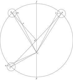 | Keywords: Coppernicus 107.svg de à ber die Kreisbewegungen der Weltkörper 107 File Kreisbewegungen-Coppernicus-0 djvu p 294 1879 w Nicolaus Copernicus File Coppernicus_107 png PD-old-100 De revolutionibus drawings LaTeX Source Code <syntaxhighlight lang latex > complile with »pdflatex« \documentclasstikz convert pdf2svg standalone \usepackage tkz-euclide \usetkzobj all \begin document \begin tikzpicture \tkzSetUpLineline width 0 4pt \pgfmathsetmacro \DA 5 25 ; \pgfmathsetmacro \AN 0 6 ; \tkzDefPoint 47 \DA A \tkzDefPoint 132 \DA B \tkzDefPoint -134 \DA C \tkzDefPoint 0 0 D \tkzDefPoint -90 2 9 \AN E \tkzDefPoint 90 \DA F \tkzDefPoint -90 \DA G \begin pgfinterruptboundingbox \tkzInterLCR D A A \AN cm \tkzGetPoints A1 A2 \tkzInterLCR D B B \AN cm \tkzGetPoints B1 B2 \tkzInterLCR D C C \AN cm \tkzGetPoints C1 C2 \end pgfinterruptboundingbox \tkzDefPointByrotation center A angle -50 A1 \tkzGetPoint L \tkzDefPointByrotation center B angle 50 B1 \tkzGetPoint M \tkzDefPointByrotation center C angle 120 C1 \tkzGetPoint N \tkzInterLL D B E M \tkzGetPoint X \tkzDrawCircle D A \tkzDrawCircle A L \tkzDrawCircle B M \tkzDrawCircle C N \draw F -- G ; \draw D -- A ; \draw D -- B ; \draw D -- C ; \draw E -- A ; \draw E -- L ; \draw A -- L ; \draw E -- B ; \draw E -- M ; \draw B -- M ; \draw E -- C ; \draw E -- N ; \draw C -- N ; \draw A + 47 0 2 node a ; \draw B + 132 0 2 node b ; \draw C + -134 0 2 node c ; \draw D + 180 0 25 node d ; \draw E + -30 0 2 node e ; \draw F + 90 0 25 node f ; \draw G + -90 0 2 node g ; \draw L + 170 0 2 node l ; \draw M + 0 0 2 node m ; \draw N + 180 0 2 node n ; \draw X + 30 0 2 node x ; \end tikzpicture \end document </syntaxhighlight> |