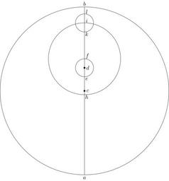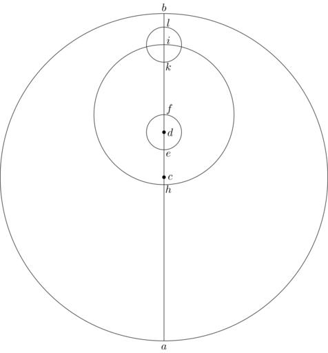 | Keywords: Coppernicus 116.svg de à ber die Kreisbewegungen der Weltkörper 116 File Kreisbewegungen-Coppernicus-0 djvu p 309 1879 w Nicolaus Copernicus File Coppernicus_116 png PD-old-100 De revolutionibus drawings LaTeX Source Code <syntaxhighlight lang latex > complile with »pdflatex« \documentclasstikz convert pdf2svg standalone \usepackage tkz-euclide \usetkzobj all \begin document \begin tikzpicture \tkzSetUpLineline width 0 4pt \pgfmathsetmacro \CA 5 3 ; \pgfmathsetmacro \CD 0 275 \CA ; \pgfmathsetmacro \DF 0 39 \CD ; \pgfmathsetmacro \dot 0 05 ; \tkzDefPoint -90 \CA A \tkzDefPoint 90 \CA B \tkzDefPoint 0 0 C \tkzDefPoint 90 \CD D \tkzDefPoint 90 \CD-\DF E \tkzDefPoint 90 0 81 \CA I \coordinate K at I + -90 \DF ; \begin pgfinterruptboundingbox \tkzInterLC B A D E \tkzGetPoints F E \tkzInterLC B A F I \tkzGetPoints I H \tkzInterLC B A I K \tkzGetPoints L K \end pgfinterruptboundingbox \tkzDrawCircle C A \tkzDrawCircle D F \tkzDrawCircle F I \drawfill C circleradius \dot; \drawfill D circleradius \dot; \tkzDrawCircle I K \draw A -- B ; \draw A + -90 0 2 node a ; \draw B + 90 0 2 node b ; \draw C + 0 0 2 node c ; \draw D + 0 0 2 node d ; \draw E + -45 0 2 node e ; \draw F + 45 0 25 node f ; \draw H + -45 0 2 node h ; \draw I + 45 0 2 node i ; \draw K + -45 0 2 node k ; \draw L + 45 0 2 node l ; \end tikzpicture \end document </syntaxhighlight> |