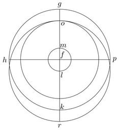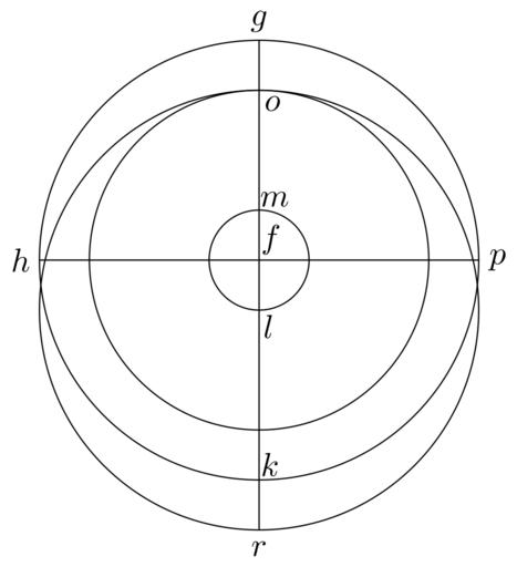 | Keywords: Coppernicus 124.svg de à ber die Kreisbewegungen der Weltkörper 124 File Kreisbewegungen-Coppernicus-0 djvu p 322 1879 w Nicolaus Copernicus File Coppernicus_124 png PD-old-100 De revolutionibus drawings LaTeX Source Code <syntaxhighlight lang latex > complile with »pdflatex« \documentclasstikz convert pdf2svg standalone \usepackage tkz-euclide \usetkzobj all \begin document \begin tikzpicture \tkzSetUpLineline width 0 4pt \pgfmathsetmacro \FG 2 33 ; \pgfmathsetmacro \FL 0 53 ; \tkzDefPoint 0 0 F \tkzDefPoint 90 \FG G \tkzDefPoint 180 \FG H \tkzDefPoint -90 \FG K \tkzDefPoint -90 \FL L \tkzDefPoint 90 \FL M \tkzDefPoint 90 \FG-\FL O \tkzDefPoint 0 \FG P \tkzDefPoint -90 \FG+\FL R \tkzDrawCircle F G \tkzDrawCircle F M \tkzDrawCircle F O \tkzDrawCircle L O \draw G -- R ; \draw H -- P ; \draw F + 60 0 25 node f ; \draw G + 90 0 2 node g ; \draw H + 180 0 2 node h ; \draw K + 55 0 2 node k ; \draw L + -60 0 2 node l ; \draw M + 35 0 2 node m ; \draw O + -45 0 2 node o ; \draw P + 0 0 2 node p ; \draw R + -90 0 2 node r ; \end tikzpicture \end document </syntaxhighlight> |