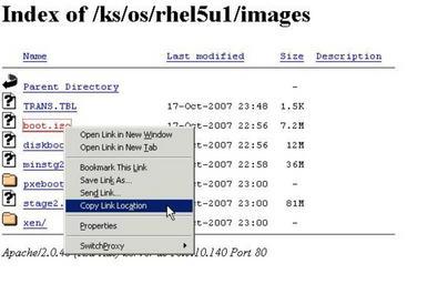 | Keywords: Copy link.JPG en Screenshot of a directory named <tt>/ks/os/rhel51u1/images</tt> from an Apache web server on a web browser in Microsoft Windows with a right-click menu shown screen capture Roel Keizer Web browser screenshots Menus GUI File directories Red Hat Enterprise Linux |