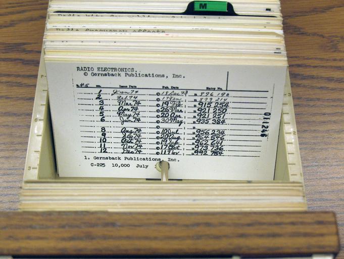 | Keywords: Copyright Radio Electronics 1974.jpg en Copyright catalogs at the Library of Congress Located in room LM-404 of the James Madison Memorial Building Washington DC Own Michael Holley Swtpc6800 2009-04-30 File Copyright Card Catalog Files jpg File Copyright Card Catalog Drawer jpg Copyright Office Card catalogs Photographs by User Swtpc6800 |
