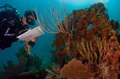 | Keywords: virgin islands national park nps ccrp climate change climatechange global warming globalwarming coral reef bleaching underwater water A warmer climate impacts oceans in other ways beyond rising sea levels; coral reefs such as this one in Virgin Islands National Park are dying. Warmer ocean temperatures and more acidic waters (from increased carbon dioxide levels) are bleaching and dissolving coral reefs around the world. Reefs in Biscayne National Park, National Park of American Samoa, and War in the Pacific National Historical Park are also being impacted. This scientist is studying coral reefs in Virgin Islands National Park. Learn more about coral bleaching and disease at science.nature.nps.gov/im/units/sfcn/monitor/marine/coral... A warmer climate impacts oceans in other ways beyond rising sea levels; coral reefs such as this one in Virgin Islands National Park are dying. Warmer ocean temperatures and more acidic waters (from increased carbon dioxide levels) are bleaching and dissolving coral reefs around the world. Reefs in Biscayne National Park, National Park of American Samoa, and War in the Pacific National Historical Park are also being impacted. This scientist is studying coral reefs in Virgin Islands National Park. Learn more about coral bleaching and disease at science.nature.nps.gov/im/units/sfcn/monitor/marine/coral... |