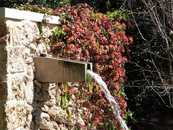 Keywords: coral trumpet vine water feature blooms