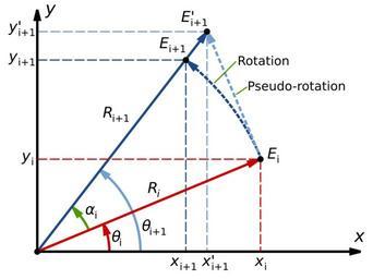 Keywords: CORDIC Pseudo-rotation.svg en A diagram showing the effect of a CORDIC pseudo-rotation as opposed to a real rotation Own Inductiveload 2009-05-30 CORDIC