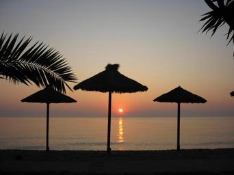 Keywords: corfu holiday sunset back light parasols sea greece holiday destination sky water island abendstimmung