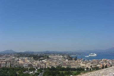 | Keywords: Corfu town.3.2009.JPG en A view of Corfu city from the top of Old Fortress It shows the port with two ships of them a Cruise ship In the centre of the image is the New fortress In the background is the hills and mountains with a blue and none cloudy sky's 2009-07-18 own Ryan kirk cc-by-sa-3 0 PD-EEA Uploaded with UploadWizard Corfu |