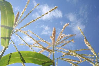 Keywords: corn cornstalk cornfield sky plant maize yellow green blue vegetable agriculture rural summer crop farming food grow clouds leaf stalks agricultural farmland nature