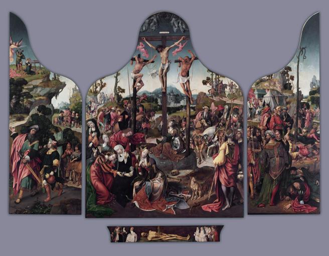 | Keywords: Cornelis Engebrechtsz. - Crucifixion Altarpiece - WGA07521.jpg  Artwork Creator Cornelis Engebrechtsz Other date ~ 1510-1520 Oil on panel cm 213 278 Institution Museum De Lakenhal 06 S+93 Kruisiging van Christus Other date ~ 1510 cm 198 5 146 central panel cm 15 109 predella cm 182 5 66 each wing 216171 LangSwitch The sacrifice of Isaac left ; The crucifixion middle ; The adoration of the brazen serpent right ; The mocking of Christ verso left ; Christ in distress sitting on the cold stone verso right ; The body of Adam flanked by Saint Martin of Tours Saint Augustine and the donors predella Het offer van Isaak links ; De kruisiging midden ; De aanbidding van de koperen slang rechts ; De bespotting buitenzijde links ; Christus op de koude steen buitenzijde rechts ; Het lijk van Adam geflankeerd door de HH Martinus van Tours en Augustinus en de stichters predella ~ 1515-1517 cm 213 278 20041926 Kreuzigung Christi 1508/1512 http //www wga hu/html/e/engelbre/crucifix html Crucifixion Altarpiece Other date decade 1510 object history between 1508 1522 commission Klooster Mariƫnpoel Oegsgeest ProvenanceEvent 1604 transfer LangSwitch das the au het stadhuis Leiden Klooster Mariƫnpoel Oegsgeest ProvenanceEvent 1869 conveyance LangSwitch das the au ~ Museum De Lakenhal Leiden stadhuis Leiden credit line accession number S 93 WGA link 7521 http //www wga hu/art/e/engelbre/crucifix jpg http //www wga hu/html/e/engelbre/crucifix html painting religious Netherlandish 1501-1550 PD-old-100 Cornelis Engebrechtsz 1510 Paintings in the Museum De Lakenhal Engebrechtsz Cornelis 1510 16th-century oil on panel paintings in the Netherlands WGA form painting WGA type religious WGA School Netherlandish WGA time period 1501-1550 Altar paintings 16th-century paintings of the Crucifixion of Christ Donor portraits with Crucifixion Christ on the Cold Stone |