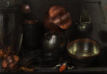 | Keywords: Cornelis Jacobsz. Delff - Allegory of the Four Elements - 2002.151 - Minneapolis Institute of Arts.jpg shiny copper and silver metal pots and pans; candlestick in ULC; bunch of onions and 2 fish LLQ; 5 small birds LRQ 27 3/4 x 40 in 70 49 x 101 6 cm sight 38 11/16 x 51 1/8 in 98 27 x 129 86 cm outer frame 2002 151 https //api artsmia org/images/62510/3683/large jpg Q1700481 Oil on panel Allegory of the Four Elements https //collections artsmia org/index php page detail id 62510 Q20891708 |