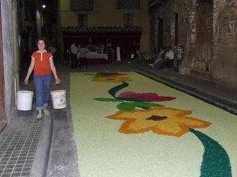 | Keywords: Corpus Christi flower carpet in Tamarite 2006-021.jpg Corpus Christi celebration on Tamarite de Litera Year 2006 Carpet arriving almost in front of the altar It's almost 2 00 AM and the complicated drawing on the front of the altar can't be started until the altar is prepared Corpus Christi en Tamarite de Litera Año 2006 Alfombra llegando casi enfrente del altar Son casi las dos de la maána y el complicado dibujo enfrente del altar no puede ser comenzado hasta que se haya terminado de preparar el altar Own Enric Naval 2006-06-18 01 48 23 Corpus Christi in Tamarite de Litera |