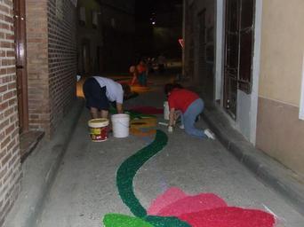 | Keywords: Corpus Christi flower carpet in Tamarite 2006-022.jpg Corpus Christi celebration on Tamarite de Litera Year 2006 People hard at work near 2 00 AM filling the chalk outlines with coloured sawdust The blue line indicates the centrer of a street to help the people who draws the chalk outlines The bright thing on the right is the reflecting paint of a priority sign Corpus Christi en Tamarite de Litera Año 2006 Gente trabajando duro cerca de las dos de la mañana La linea azul indica el centro de la calle para ayudar a la gente que dibuja los trazados en tiza La cosa brillante a la derecha es la pintura reflectante de una señal de ceda el paso Own Enric Naval Corpus Christi in Tamarite de Litera Sawdust carpets |