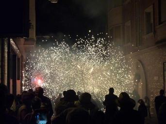| Keywords: Correfocs (literally in English "fire-runs") are among the most striking features present in Catalan festivals. In the correfoc, a group of individuals will dress as devils and light fireworks - fixed on devil's pitchforks or strung above the route. Dancing to the sound of a rhythmic drum group, they set off their fireworks among crowds of spectators. The spectators that participate dress to protect themselves against small burns and attempt to get as close as possible to the devils... running with the fire. Other spectators will watch from 'safe' distances, rapidly retreating as necessary. culture catalan correfoc terrassa països catalans fmterrassa2016 |
