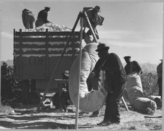 | Keywords: Cortaro Farms, Pinal County, Arizona. Cotton pickers weigh, haul, and dump their sacks at the cotton . . . - NARA - 522201.tif Scope and content Full caption reads as follows Cortaro Farms Pinal County Arizona Cotton pickers weigh haul and dump their sacks at the cotton wagon on large-scale industrialized farm General notes 522201 Local identifier 83-G-44032 Department of Agriculture Bureau of Agricultural Economics Division of Economic Information ca 1922 - ca 1953 NARA-Author Lange Dorothea 1895-1965 Photographer 1372774 <br /> Still Picture Records Section Special Media Archives Services Division NWCS-S National Archives at College Park 8601 Adelphi Road College Park MD 20740-6001 11/1940 Record group Record Group 83 Records of the Bureau of Agricultural Economics 1876 - 1959 Record group ARC 412 Photographic Prints Documenting Programs and Activities of the Bureau of Agricultural Economics and Predecessor Agencies compiled ca 1922 - ca 1947 documenting the period ca 1911 - ca 1947 Series ARC 521048 File unit File unit ARC Variant control numbers NAIL Control Number NWDNS-83-G-44032 yes Other versions <gallery> File Cortaro_Farms _Pinal_County _Arizona _Cotton_pickers_weigh _haul _and_dump_their_sacks_at_the_cotton_ _ _ _-_NARA_-_522201 tif tif File Cortaro_Farms _Pinal_County _Arizona _Cotton_pickers_weigh _haul _and_dump_their_sacks_at_the_cotton_ _ _ _-_NARA_-_522201 jpg jpg </gallery> NARA-cooperation PD-USGov Dorothea Lange Cortaro Farms Cotton sacks Cotton industry in the United States November 1940 in the United States 1940 in Arizona Men at work in the United States Agricultural vehicles Wagons in the United States Weighing scales in the United States Men with hats NARA TIF images with categorized JPGs Cotton industry in Arizona |