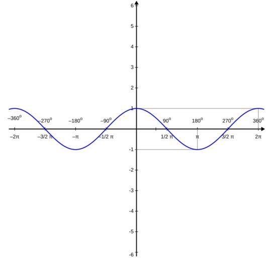 | Keywords: Cos proportional2.svg Plot of cos x with proportional scales and the gnuplot source Version with size compatible with other my plots to fit one gallery box see pl Funkcje trygonometryczne Wykresy dla argumentów rzeczywistych Own Olaf m Image Cos_proportional svg <pre> set terminal svg enhanced font Arial 10 size 658 620 set output 'c \temp\cos2 svg' set border 0 set style arrow 2 head filled lw 2 size 0 15 30 set style arrow 4 nohead set samples 1000 unset key set xtics axis ÔÇô2¤Ç -2 pi ÔÇô3/2 ¤Ç -1 5 pi ÔÇô¤Ç -pi ÔÇô1/2 ¤Ç -pi/2 1 1/2 ¤Ç pi/2 ¤Ç pi 3/2 ¤Ç 1 5 pi 2¤Ç 2 pi scale 0 5 set x2tics axis ÔÇô360 o -2 pi ÔÇô270 o -1 5 pi ÔÇô180 o -pi ÔÇô90 o -pi/2 90 o pi/2 180 o pi 270 o 1 5 pi 360 o 2 pi scale 0 5 offset 0 2 7 set style line 3 lw 1 lt 5 lc rgb black set style line 1 lc rgb blue lw 2 set ytics axis -6 -5 -4 -3 -2 -1 1 2 3 4 5 6 scale 0 5 set arrow arrowstyle 2 from -2 pi-0 3 0 to 2 pi+0 3 0 set arrow arrowstyle 2 from 0 -6 2 to 0 6 2 set arrow arrowstyle 4 linestyle 0 from 0 1 to 2 pi 1 set arrow arrowstyle 4 linestyle 0 from 2 pi 1 to 2 pi 0 set arrow arrowstyle 4 linestyle 0 from 0 -1 to pi -1 set arrow arrowstyle 4 linestyle 0 from pi -1 to pi 0 plot -2 pi-0 3 2 pi+0 3 -6 6 cos x linestyle 1 set output unset arrow unset label </pre> SVG trigonometry Cosine function |