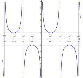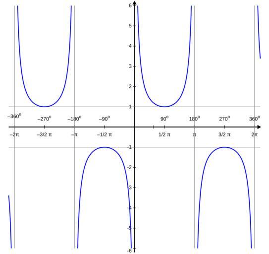 | Keywords: Cosec proportional.svg Plot of cosec x 1/sin x with proportional scales and the gnuplot source Own Olaf m Created with Gnuplot set terminal svg enhanced font Arial 10 size 658 620 set output 'c \temp\cosec svg' set border 0 set style arrow 2 head filled lw 2 size 0 15 30 set style arrow 4 nohead set samples 1000 unset key set xtics axis ÔÇô2¤Ç -2 pi ÔÇô3/2 ¤Ç -1 5 pi ÔÇô¤Ç -pi ÔÇô1/2 ¤Ç -pi/2 1 1/2 ¤Ç pi/2 ¤Ç pi 3/2 ¤Ç 1 5 pi 2¤Ç 2 pi scale 0 5 set x2tics axis ÔÇô360 o -2 pi ÔÇô270 o -1 5 pi ÔÇô180 o -pi ÔÇô90 o -pi/2 90 o pi/2 180 o pi 270 o 1 5 pi 360 o 2 pi scale 0 5 offset 0 2 7 set style line 3 lw 1 lt 5 lc rgb black set style line 1 lc rgb blue lw 2 set ytics axis -6 -5 -4 -3 -2 -1 1 2 3 4 5 6 scale 0 5 set arrow arrowstyle 2 from -2 pi-0 3 0 to 2 pi+0 3 0 set arrow arrowstyle 2 from 0 -6 2 to 0 6 2 set arrow arrowstyle 4 linestyle 0 from -2 pi-0 3 -1 to 2 pi+0 3 -1 set arrow arrowstyle 4 linestyle 0 from -2 pi-0 3 1 to 2 pi+0 3 1 set arrow arrowstyle 4 linestyle 0 from -2 pi -6 to -2 pi 6 set arrow arrowstyle 4 linestyle 0 from -pi -6 to -pi 6 set arrow arrowstyle 4 linestyle 0 from pi -6 to pi 6 set arrow arrowstyle 4 linestyle 0 from 2 pi -6 to 2 pi 6 plot -2 pi-0 3 2 pi+0 3 -6 6 1/sin x linestyle 1 set output unset arrow unset label SVG trigonometry Cosecant function |