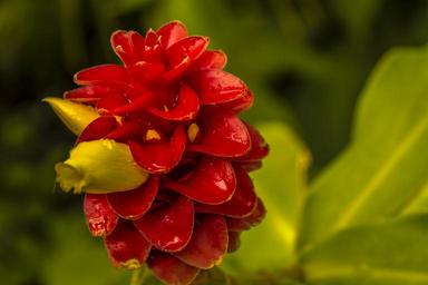| Keywords: outdoor plant flower flower cluster depth of field Costus barbatus, also known as spiral ginger, is a perennial plant with a red inflorescence. It is one of the most commonly cultivated Costus species. The foliage of Costus barbatus is dark green and fuzzy underneath. The long red inflorescences are complimented with bright yellow tubular flowers. Clumps spread easily and produce plants that normally get to six feet tall. Costus barbatus is native to Costa Rica. Plants are pollinated by hummingbirds.[2] Costus barbatus are popular as cut flowers. en.wikipedia.org/wiki/Costus_barbatus Costus barbatus, also known as spiral ginger, is a perennial plant with a red inflorescence. It is one of the most commonly cultivated Costus species. The foliage of Costus barbatus is dark green and fuzzy underneath. The long red inflorescences are complimented with bright yellow tubular flowers. Clumps spread easily and produce plants that normally get to six feet tall. Costus barbatus is native to Costa Rica. Plants are pollinated by hummingbirds.[2] Costus barbatus are popular as cut flowers. en.wikipedia.org/wiki/Costus_barbatus |