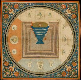 | Keywords: Cosmological Mandala with Mount Meru.jpg K'o-ssu depicting w Mount Meru Yuan dynasty 1271 “1368 Silk tapestry kesi 33 x 33 in 83 8 x 83 8cm This elaborate tapestry-woven mandala or cosmic diagram illustrates Indian imagery introduced into China in conjunction with the advent of Esoteric Buddhism At the center is the mythological Mount Meru represented as an inverted pyramid topped by a lotus a Buddhist symbol of purity Traditional Chinese symbols for the sun three-legged bird and moon rabbit appear at the mountain ™s base The landscape vignettes at the cardinal directions represent the four continents of Indian mythology but follow the conventions of Chinese-style blue-and-green landscapes The dense floral border derives from imagery of central Tibet particularly from monasteries with ties to the court of the Yuan dynasty http //www metmuseum org/collections/search-the-collections/60006768 fullscreen author century 14 PD-old-100 Mount Meru mythology Silk textiles Paintings uploaded by Chris Woodrich Mythological cosmologies |