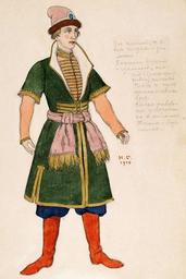 | Keywords: Costume for Russian dances by I.Bilibin (1910, Saratov museum) 2.jpg Девица Эскиз костюма для балетной сюиты Русские пляски 1910 34х24 2 ФГУК Са атовский госуда ственный художественный музей имени А Радищева Аннотация а эскизе изоб ажена молодая голубоглазая и усоволосая девушка в усском на одном костюме кото ый состоит из к асного са афана белой со очки и бо довой косынки а голове девицы высокий кокошник ук ашенный жемчужными к угами К кокошнику п ик еплены подвески из жемчуга - ясы или поднизи а эскизе слева и сп ава от изоб ажения имеются авто ские указания костюме ам В 1910 году И Я Билибин также тщательно исполнил два па ных эскиза Девица и олодец п едназначенных для балетной сюиты Русские пляски в кото ой блистали известные танцовщики Анна Павлова и ихаил о дкин а эскизе женского костюма пе ед нами п едстает молодая девушка с голубыми глазами и светлыми волосами Она одета в белую вышитую со очку с ши окими укавами кото ые сужаются к запястьям на плечи девицы наб ошена бо довая косынка Пове х со очки надет т адиционный усский са афан к асного цвета ук ашенный золотистой тесьмой и длинным ядом пуговиц Самым главным ук ашением костюма является пышный головной убо - кокошник кото ому авто посвятил большую часть коммента иев помещенных на полях листа Высокое очелье кокошника асшито жемчужными кольцами ст азами тесьмой и шелком и ук ашено жемчужными подвесками - поднизями Подобный на яд напоминает о на одном костюме севе ных областей России http //school-collection edu ru/catalog/rubr/b0a303cf-6d81-472d-a005-768b9abf7882/117890/ interface themcol class 43 1910 Ivan Bilibin Scenic designs by Ivan Bilibin Files uploaded by Shakko from various sources Radishchev Art Museum PD-old |