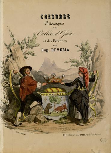 Keywords: Costumes pittoresques de la vallée d'Ossau et des Pyrénées ^^091,Titre lithographié^^093, - Fonds Ancely - B315556101 A DEVERIA 002.jpg La page de titre et les 6 planches sont signées E Devéria et sont lithographiées en couleurs et réhaussées à l'aquarelle - Cartonnage d'éditeur papier vert sur lequel la page de titre est reproduite en noir Il existe plusieurs tirages de cet ouvrage qui comprennent au moins les six planches de costumes en hauteur numérotées de 1 à 6 et selon les cas deux ou trois planches en largeur non numérotées Le premier tirage intitulé Costumes pittoresques de la vallée d'Ossau et lithographié par E Vignancour est daté de 1844 ; le tirage dont il est question ici est ultérieur sans date On note plusieurs différences entre les différents tirages les deux dernières planches notamment se distinguent voir Labarère Bibliographie pyrénéiste 486 Dans ce tirage les titres sont en capitales romaines maigres La pl 6 intitulée Guide aux Eaux-Bonnes porte les mentions Chez A Bassy Pau et Lith de E Vignancour au contraire des autres planches qui portent la mention Edité et lith par A Bassy à Pau Ancely René 1876 - 1966 Possesseur fre public domain domaine public B315556101_A_DEVERIA_002 jpg image/jpeg 1 f de pl lithogr en coul ; 42 5 cm Bassy Auguste http //numerique bibliotheque toulouse fr/collect/general/index/assoc//ark /74899/B315556101_A_DEVERIA_002 dir/B315556101_A_DEVERIA_002 jpg Bibliothèque municipale de Toulouse A-DEVERIA 1 Creator Eugène Devéria http //catalogues toulouse fr/web2/tramp2 exe/do_keyword_search/log_in setting_key BMT1 servers 1home query p000363 vignette http //numerique bibliotheque toulouse fr/collect/general/index/assoc//ark /74899/B315556101_A_DEVERIA_002 dir/B315556101_A_DEVERIA_002_thumb jpeg by 1844 Costumes pittoresques de la vallée d'Ossau et des Pyrénées Titre lithographié B315556101_A_DEVERIA_002 colour print - lithography - print - colors - color lithograph Women in art Vallée d'Ossau History of clothing Skirts in art Petticoats Berets Mountains in art Trees in art Caps in art French national costumes Historical images of Eaux-Bonnes Historical images of Pyrénées-Atlantiques People of Pyrénées-Atlantiques Eugène Devéria Gaiters National costumes in art Rocks in art Men in art Couples in art Redingotes in art Bodices |