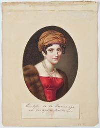 | Keywords: Countess de la Ferronnays (Middleton Album).jpg  en The Middleton Watercolor Album consists of a collection of 45 watercolor portraits bound in leather covers with neo-gothic embossing and a gilt bronze clasp in the same style The album relates to the Middleton family of South Carolina from which it descended until Hillwood purchased it in 2004 Williams Middleton who was secretary to his father Henry Middleton the American minister to St Petersburg from 1820 to 1830 assembled this album The artist of many of the watercolors most of which are unsigned is likely Middleton's sister Maria Henrietta who studied painting during her years in St Petersburg with her governess Madame Mathes who also painted miniatures Two watercolors including this portrait of the Countess Bobrinsky are signed by the well-known Russian watercolorist Petr Sokolov The portraits are of Russians and people in the foreign community who were close associates of the Middleton family Their portraits provide an extraordinary commentary on the fashion and hairstyles of the 1820s Г афиня Альбе тина де ля Фе  оне у ожденная Буше де Су ш де  онсо о ум 1848 с 1802 года жена дипломата Огюста де ля Фе  оне В б аке имела т оих детей двое из кото ых находились с  одителями во в емя их п ебывания в Пете бу ге Сын Альбе т впоследствии женился на Александ е Алопеус доче и  оссийского посла в Бе лине 1820-1830s http //www hillwoodmuseum org/collection/search s Middleton 20 20Album Brian Searby or anonymous see filename other versions PD-old-70-1923 Middleton Watercolor Album Files uploaded by Shakko from various sources Uploaded with UploadWizard |