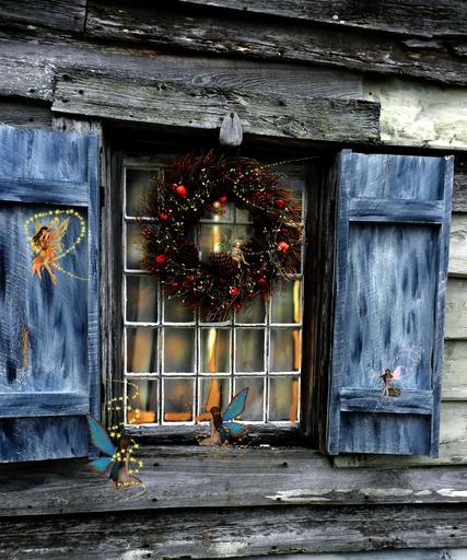 Keywords: country christmas magic wreath blue shutters window fairy fairies holiday xmas decoration red pine wooden season december seasonal warm merry celebration traditional wood