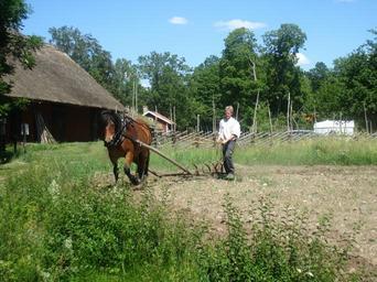 Keywords: countryside horse man plow go tree house summer sky blue grass green