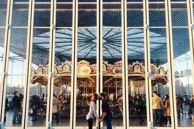 Keywords: couple kissing romance romantic love guy girl merry-go-round windows people crowd pedestrians