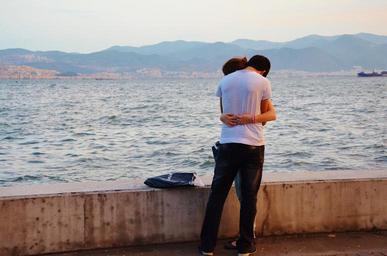 Keywords: couple love tenderness sweethearts people young river fence grille quay sea landscape beach water ocean