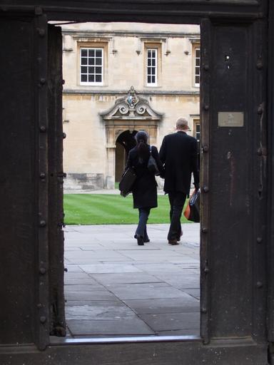 | Keywords: Couple walking into St Johns College Oxford.jpg en The inside of an Oxbridge college the front quadrangle of St John's College Oxford glimpsed through an open wicket gate Paving stones lead to a grass lawn in front of an old two-storey building in yellow-pink stone with sash windows on the upper floor above a passage entrance decorated with roccoco carving and painted crest leading to another grassed quadrangle A male and female student similarly dressed in short black coats are walking in step away from the gate and into the depths of the college carrying their bags and holding hands Own Pointillist 2009-03-27 St John's College Oxford |
