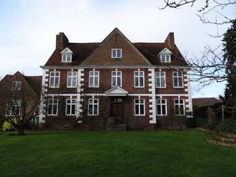| Keywords: manor architecture building outdoor country house gable roof window roof YALDING HIGH STREET TQ 6950 (west side) 6/132 Court Lodge and the Dairy House (formerly 25-7-52 listed under High Street, North Arm) GV II* Farmhouse, now house. Late C17. Chequered red and grey brick to both elevations and to gable ends, Plain tile roof. Double depth. 2 storeys, with cellar and two tiers of attics. Chamfered brick plinths. Rendered plat band. Shallow central break with rendered rusticated quoins. Similar quoins to outer ends of front elevation. Moulded wooden eaves cornice. Roof gabled to right and left. Brick gable (possibly formerly corniced) over central break, with ridge only slightly lower than that of main range. Red and grey brick gable end stacks. Two dormers with moulded wooden cornices, pedimented gables and leaded two-light casements. Small blocked window towards apex of central gable with two-light leaded casement with splayed rubbed brick voussoirs below it. Fire Insurance plaque under cill. Regular 7-window front of slightly recessed leaded wooden cross windows with splayed rubbed brick voussoirs, and raised painted keystones with cornice breaking forwards over them; three to central break and two to each side flanking it. Similar windows to ground floor (left end window on each floor blocked). Splayed rubbed brick voussoirs to cellar windows under plinth. Central door of four panels and two top lights, with two-light rectangular fanlight, and heavy flat corniced hood with moulded pedimented gable, up four steps with plain iron handrails. Rear elevation: similar, and with similar central door, but without quoins or cornice, with segmental heads to first-floor, lower and upper attic windows, and with unpedimented corniced door hood. 1½ storey section: (the Dairy House) to left (south), set back from front elevation, but of similar date; red and grey brick, partly in Flemish bond, with gabled plain tile roof, large central brick gable, tall stack adjoining main range to right, three-light ground-floor casement, and panelled door up flight of steps to left gable end. Interior: open-well principal staircase with turned balusters, moulded handrail and closed string, rising to first floor from rear of entrance hall within right (north) side of central rear break. Dog-leg service staircase with turned balusters and moulded handrail, rising from cellar to upper attic from lobby within left side of central rear break. Broad pegged doorway to former principal first-floor room from landing, and smaller pegged doorways to rear right room and to corridor within left section of house. Panelled doors. Elliptical brick fireplace with chamfered bressumer to rear and front right ground-floor rooms and front left and right first-floor rooms. Large rectangular brick fireplace to front left ground-floor room, and to front right room in cellar. Broad un-chamfered cross beam and relatively thin-scantling joists to front left and right ground-floor rooms. Broad floorboards, including attics. Each attic (lower and upper) has collars and aligned butt purlins. YALDING HIGH STREET TQ 6950 (west side) 6/132 Court Lodge and the Dairy House (formerly 25-7-52 listed under High Street, North Arm) GV II* Farmhouse, now house. Late C17. Chequered red and grey brick to both elevations and to gable ends, Plain tile roof. Double depth. 2 storeys, with cellar and two tiers of attics. Chamfered brick plinths. Rendered plat band. Shallow central break with rendered rusticated quoins. Similar quoins to outer ends of front elevation. Moulded wooden eaves cornice. Roof gabled to right and left. Brick gable (possibly formerly corniced) over central break, with ridge only slightly lower than that of main range. Red and grey brick gable end stacks. Two dormers with moulded wooden cornices, pedimented gables and leaded two-light casements. Small blocked window towards apex of central gable with two-light leaded casement with splayed rubbed brick voussoirs below it. Fire Insurance plaque under cill. Regular 7-window front of slightly recessed leaded wooden cross windows with splayed rubbed brick voussoirs, and raised painted keystones with cornice breaking forwards over them; three to central break and two to each side flanking it. Similar windows to ground floor (left end window on each floor blocked). Splayed rubbed brick voussoirs to cellar windows under plinth. Central door of four panels and two top lights, with two-light rectangular fanlight, and heavy flat corniced hood with moulded pedimented gable, up four steps with plain iron handrails. Rear elevation: similar, and with similar central door, but without quoins or cornice, with segmental heads to first-floor, lower and upper attic windows, and with unpedimented corniced door hood. 1½ storey section: (the Dairy House) to left (south), set back from front elevation, but of similar date; red and grey brick, partly in Flemish bond, with gabled plain tile roof, large central brick gable, tall stack adjoining main range to right, three-light ground-floor casement, and panelled door up flight of steps to left gable end. Interior: open-well principal staircase with turned balusters, moulded handrail and closed string, rising to first floor from rear of entrance hall within right (north) side of central rear break. Dog-leg service staircase with turned balusters and moulded handrail, rising from cellar to upper attic from lobby within left side of central rear break. Broad pegged doorway to former principal first-floor room from landing, and smaller pegged doorways to rear right room and to corridor within left section of house. Panelled doors. Elliptical brick fireplace with chamfered bressumer to rear and front right ground-floor rooms and front left and right first-floor rooms. Large rectangular brick fireplace to front left ground-floor room, and to front right room in cellar. Broad un-chamfered cross beam and relatively thin-scantling joists to front left and rig