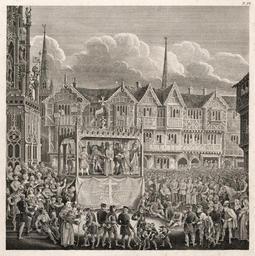 | Keywords: Coventry-mystery-pageant-thomas-sharp-david-gee-1825.jpg Thomas Sharp 1770-1841 The image was designed and executed in copper engraving by David Gee 1793-1872 It recreates a 15th-century Passion play The Trial and Crucifixion of Christ by the Smiths' Company of Coventry Many of the details are based on written accounts including pageant wagon design itself and the people in the street The audience includes men women and children along with armed guards for the wagon men who drew the wagon from station to station minstrels clerics and a carpenter The scene on stage depicts Christ with hands bound before an enthroned Pilate Annas and Caiaphas are shown in mitred hats and a boy carries a bowl of water for Pilate to wash his hands Although somewhat speculative the image has been influential and is often reproduced Beinecke Library http //brbl-dl library yale edu/vufind/Record/3447379 Designed and engraved by Creator David Gee 1825 PD-old-100 PD-1996 <gallery>File ChesterMysteryPlay 300dpi jpg Smaller later copy </gallery> Medieval theatre Passion plays Mystery play David Gee |